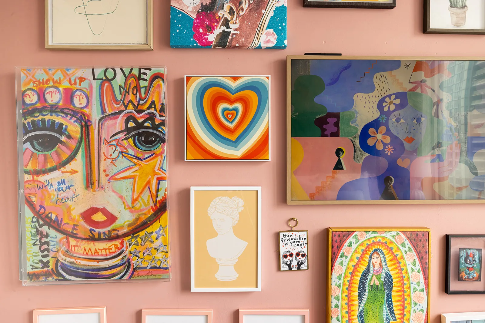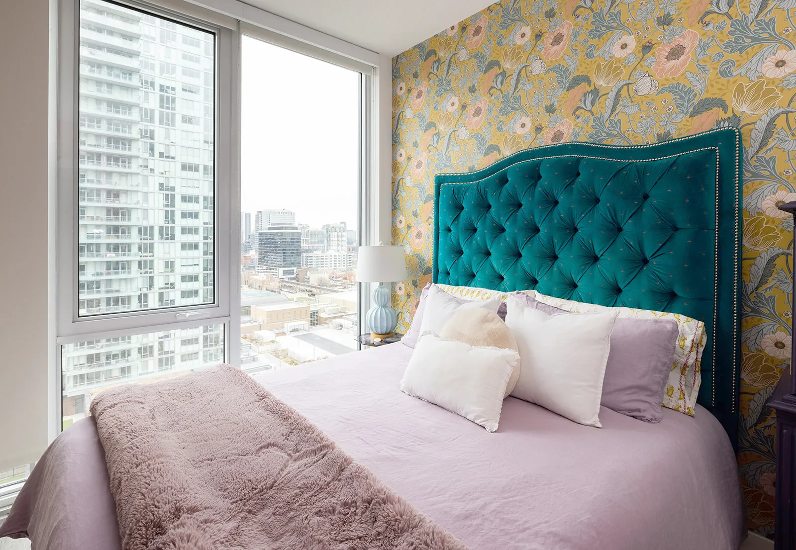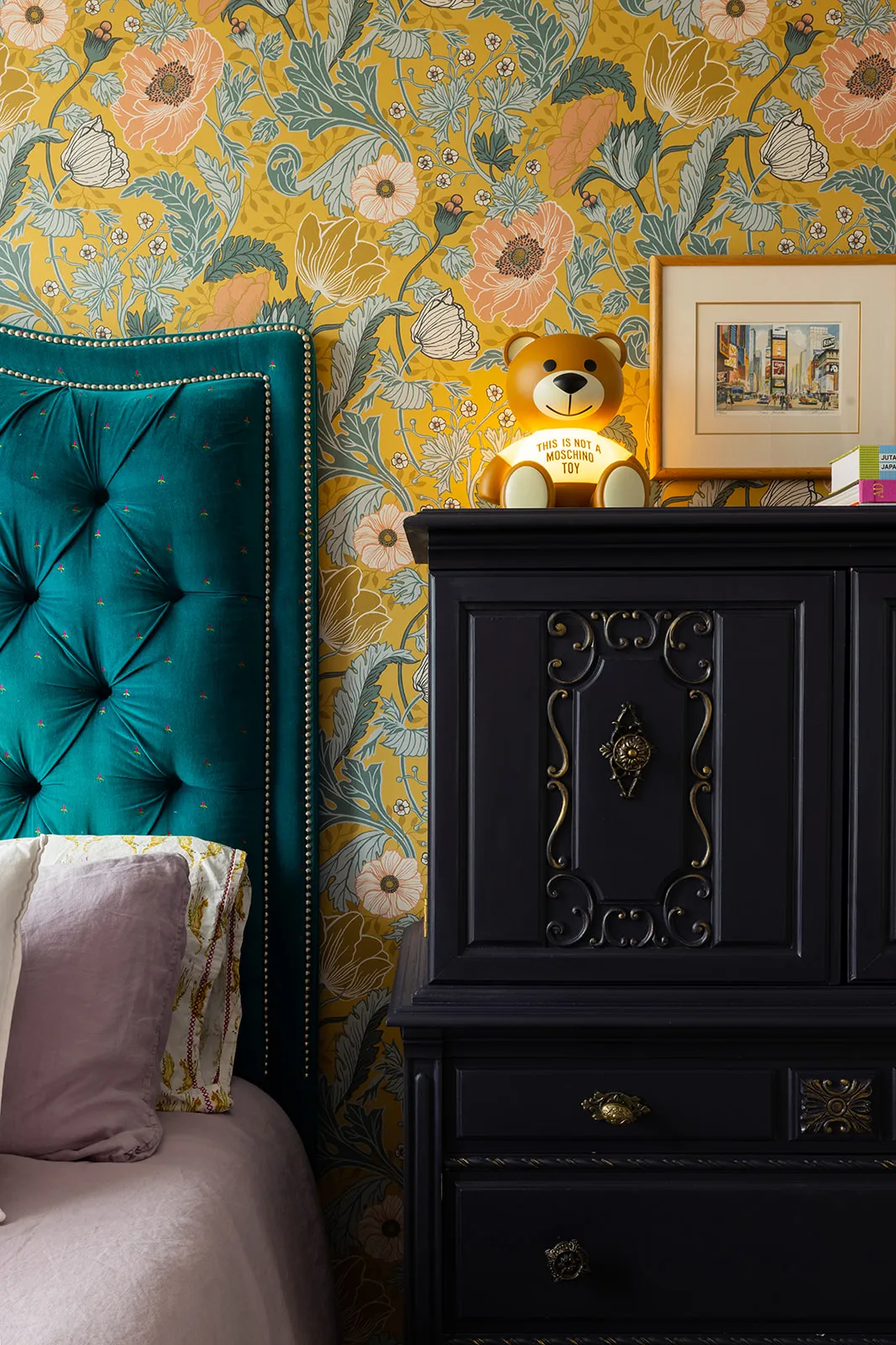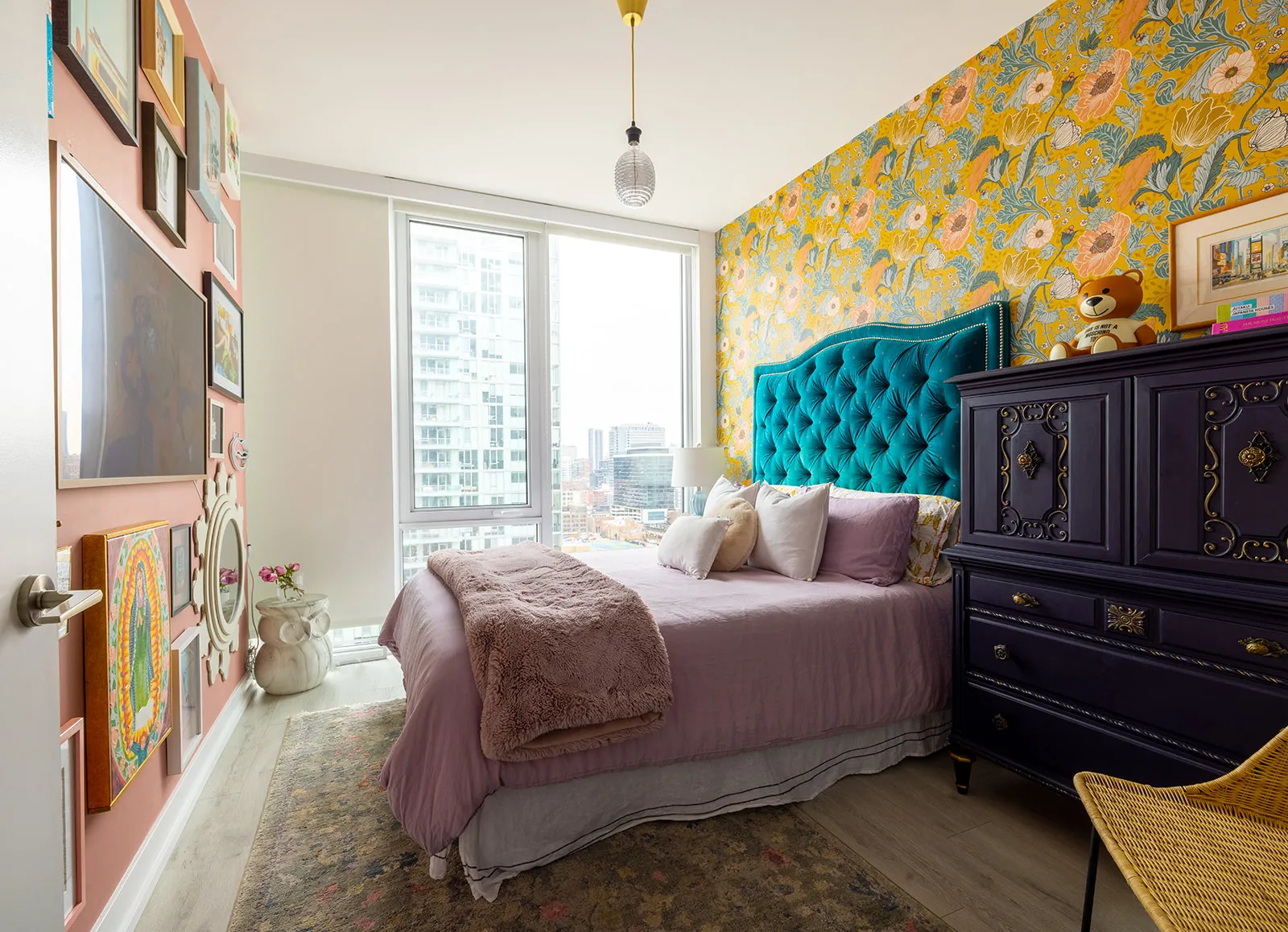 Custom furnishings anchor the space, complemented by curated vintage pieces that bring soul and individuality. In the bedroom, a tufted teal headboard creates a saturated focal point while layered textiles soften the edges. Throughout the home, statement artwork and playful accents add wit and personality without overwhelming the footprint.