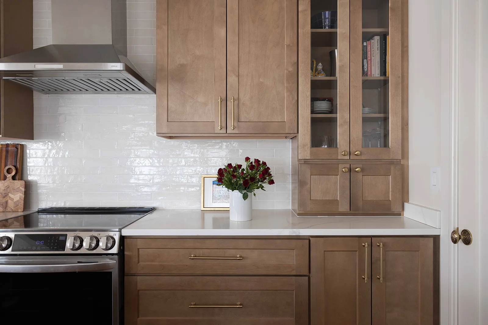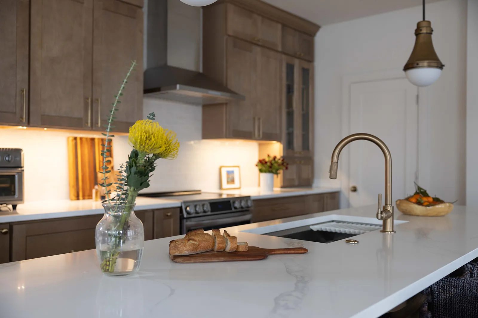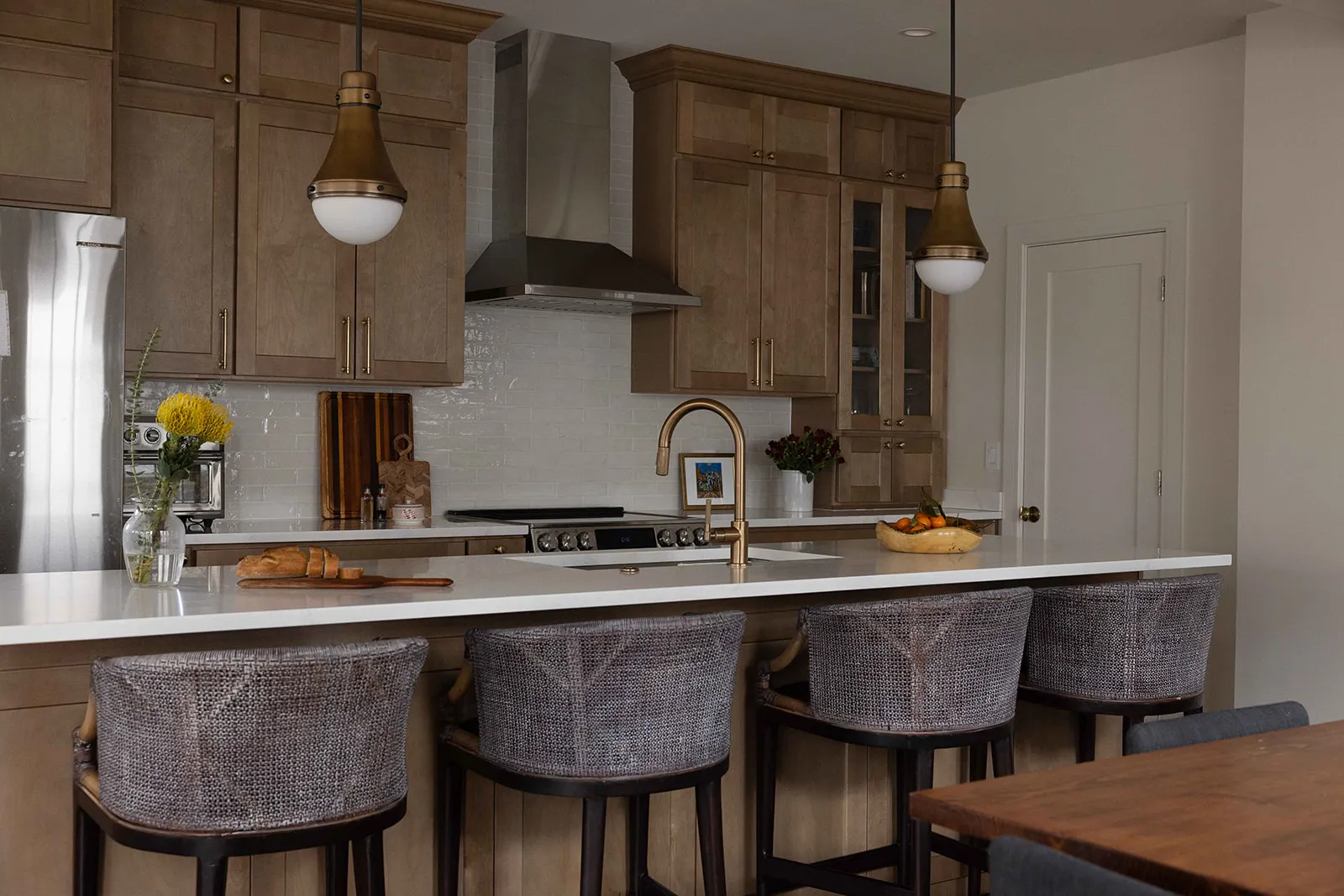 The original hardwood floors were refinished in warm walnut tones adding depth while maintaining continuity throughout the home. The kitchen is truly the heart of this renovation — designed as the central gathering space for a family who loves to cook and entertain. We created generous circulation so that people can move comfortably around the kitchen and a substantial island anchors the room so guests can convene and converse as the meal is being prepared.