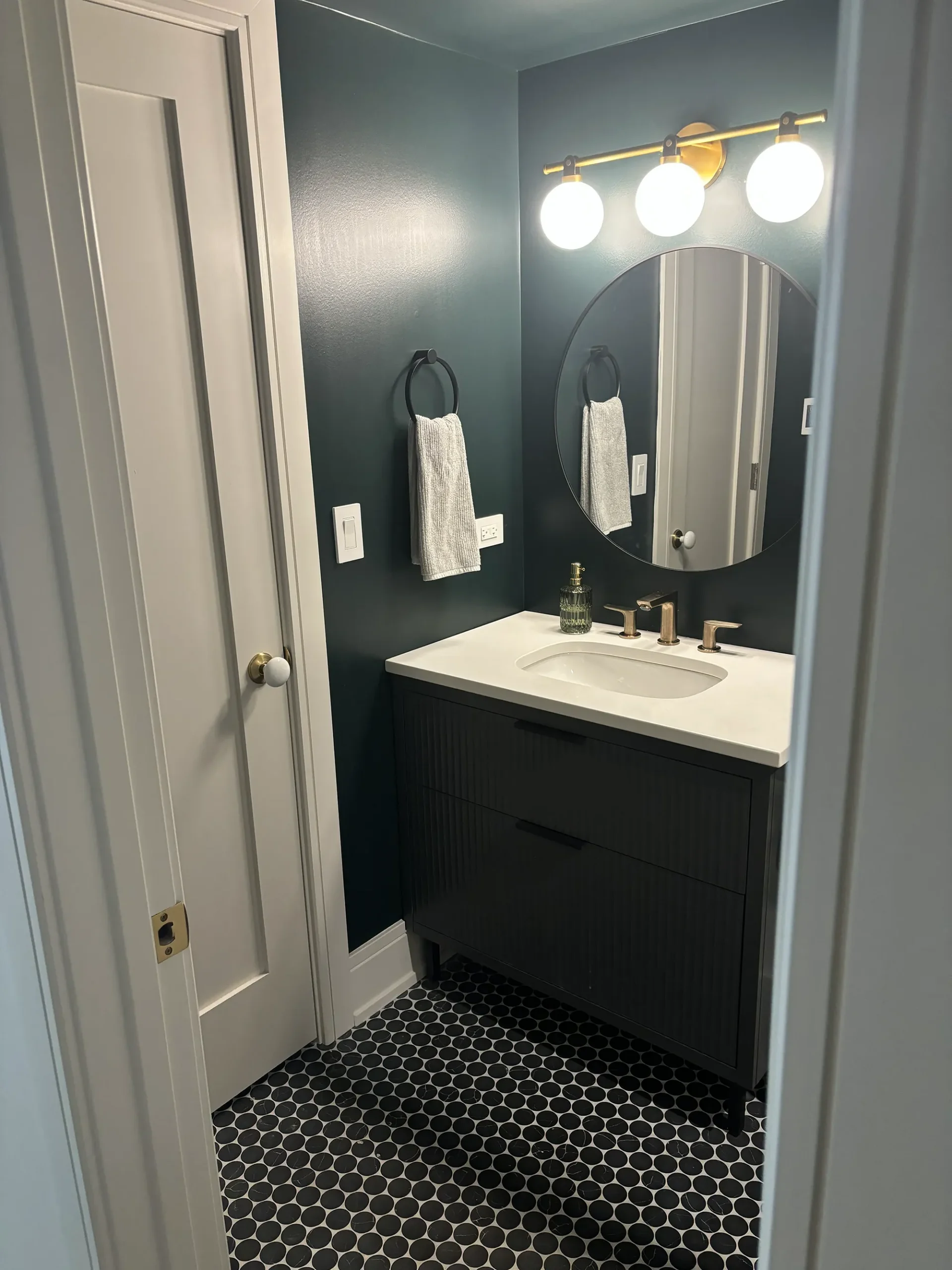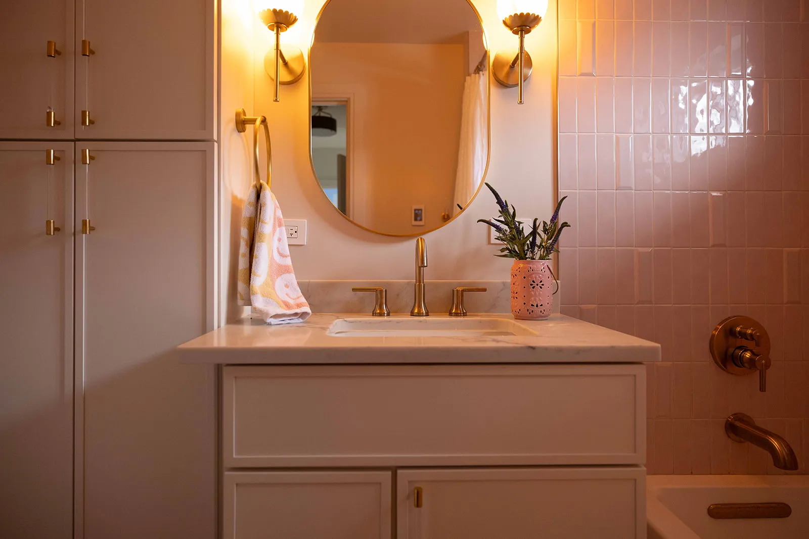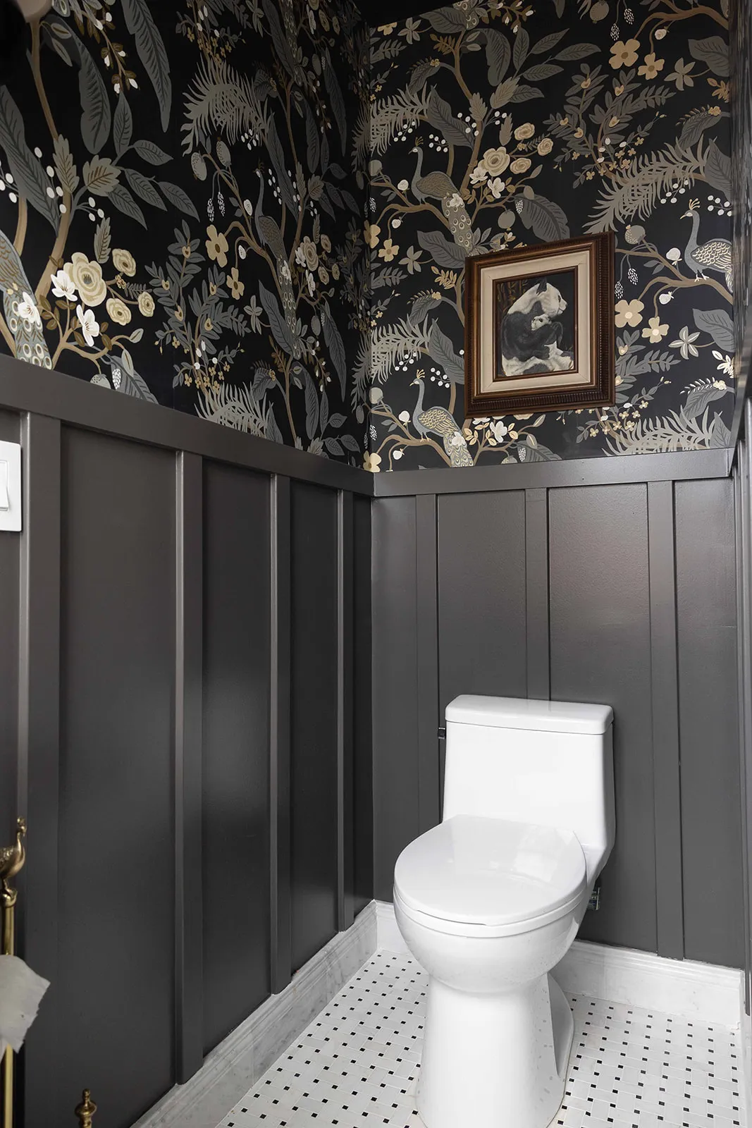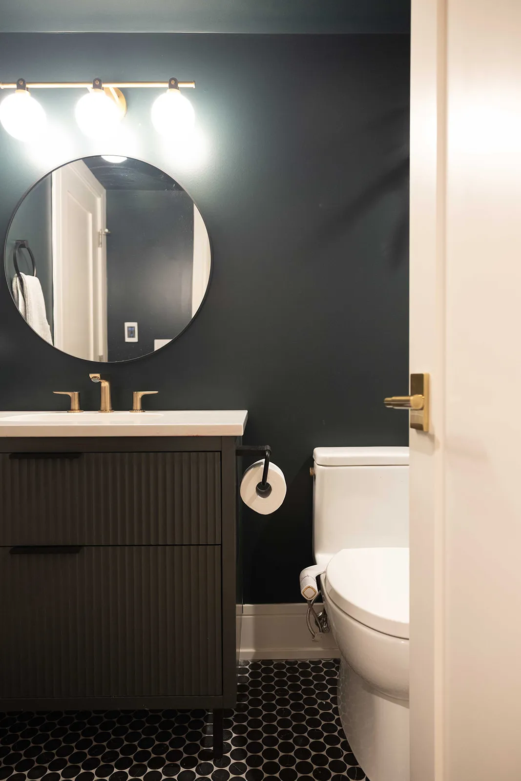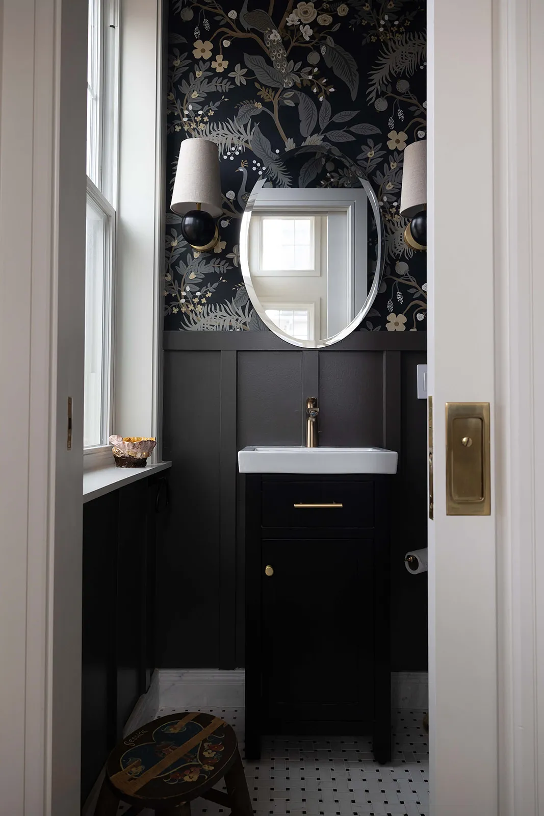 Lighting was completely reimagined throughout the home to support both daily life and evening ambiance and every bathroom was designed specifically for its user. The powder room is intentionally playful — a small but impactful jewelry box. Marble floors ground the space, while colorful wallpaper brings personality and movement. It’s intimate and it’s bold. It’s fun, impactful and unique.