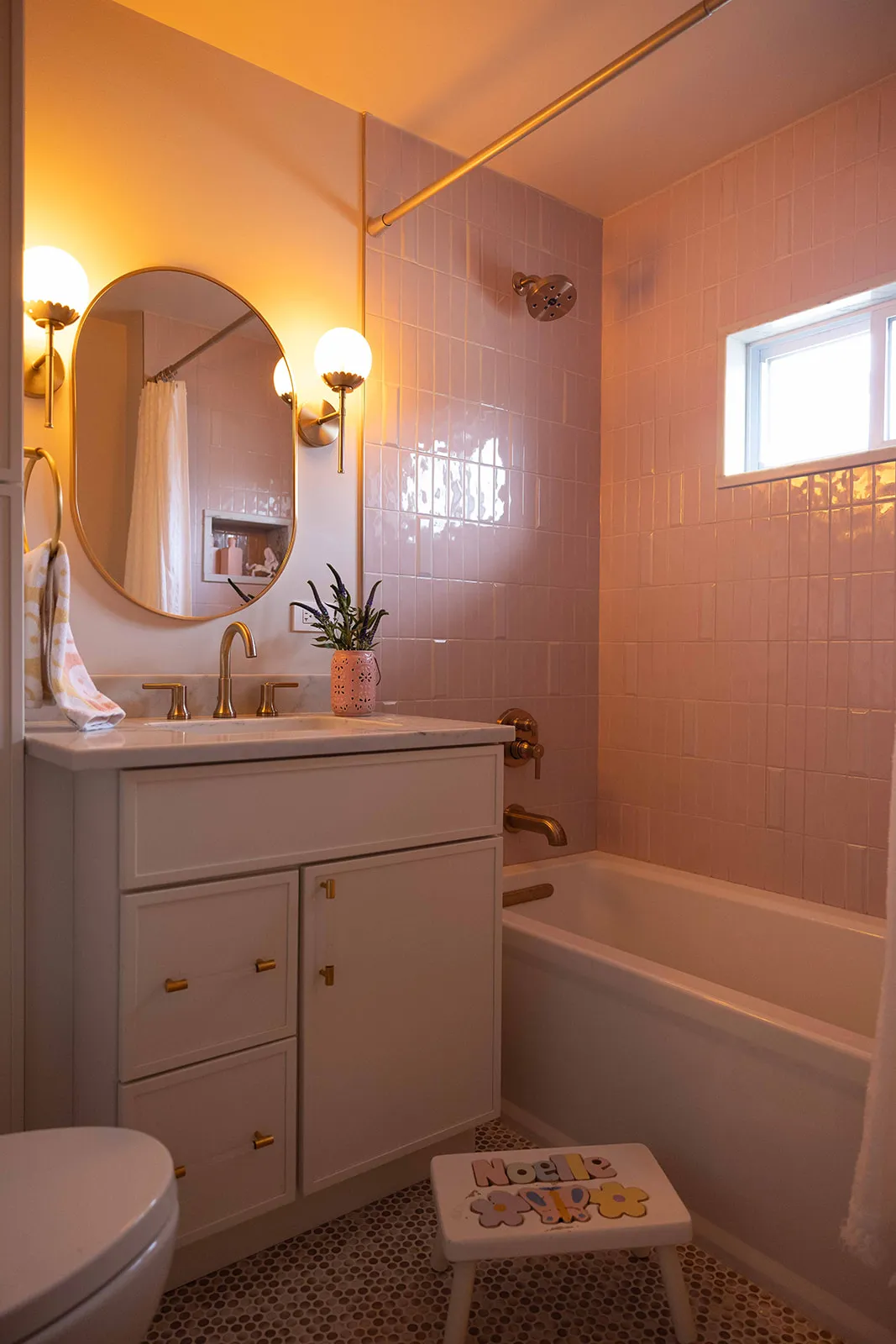 The girls’ bathroom is pretty in pink, but designed elegantly so it is able to grow with them. A large tub anchors the bathing area, paired with a custom vanity, soft pink walls, and pink stone tile. Penny rounds on the floor add a classic touch that compliments the sweetness with structure and brings refined design to a playful space.