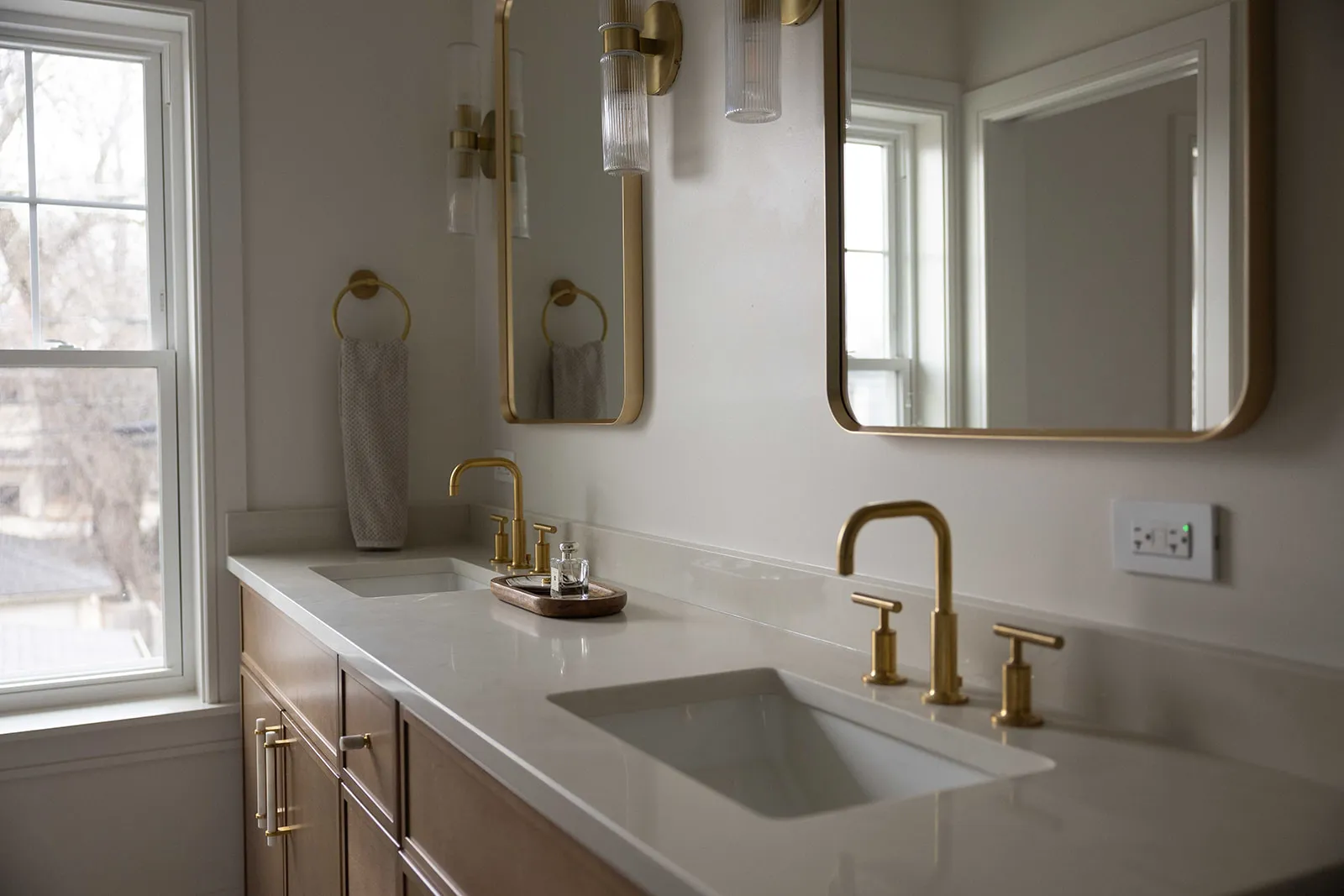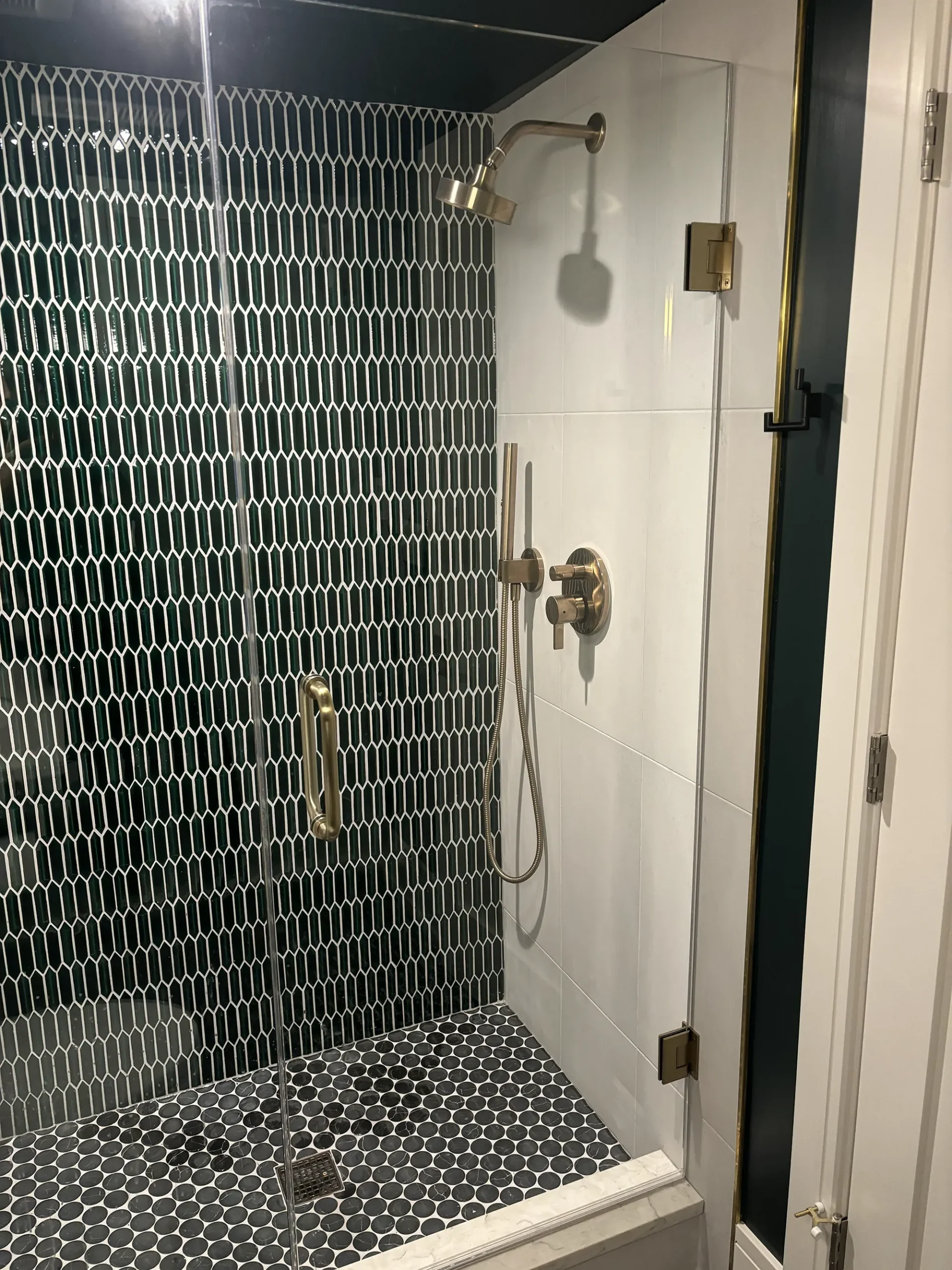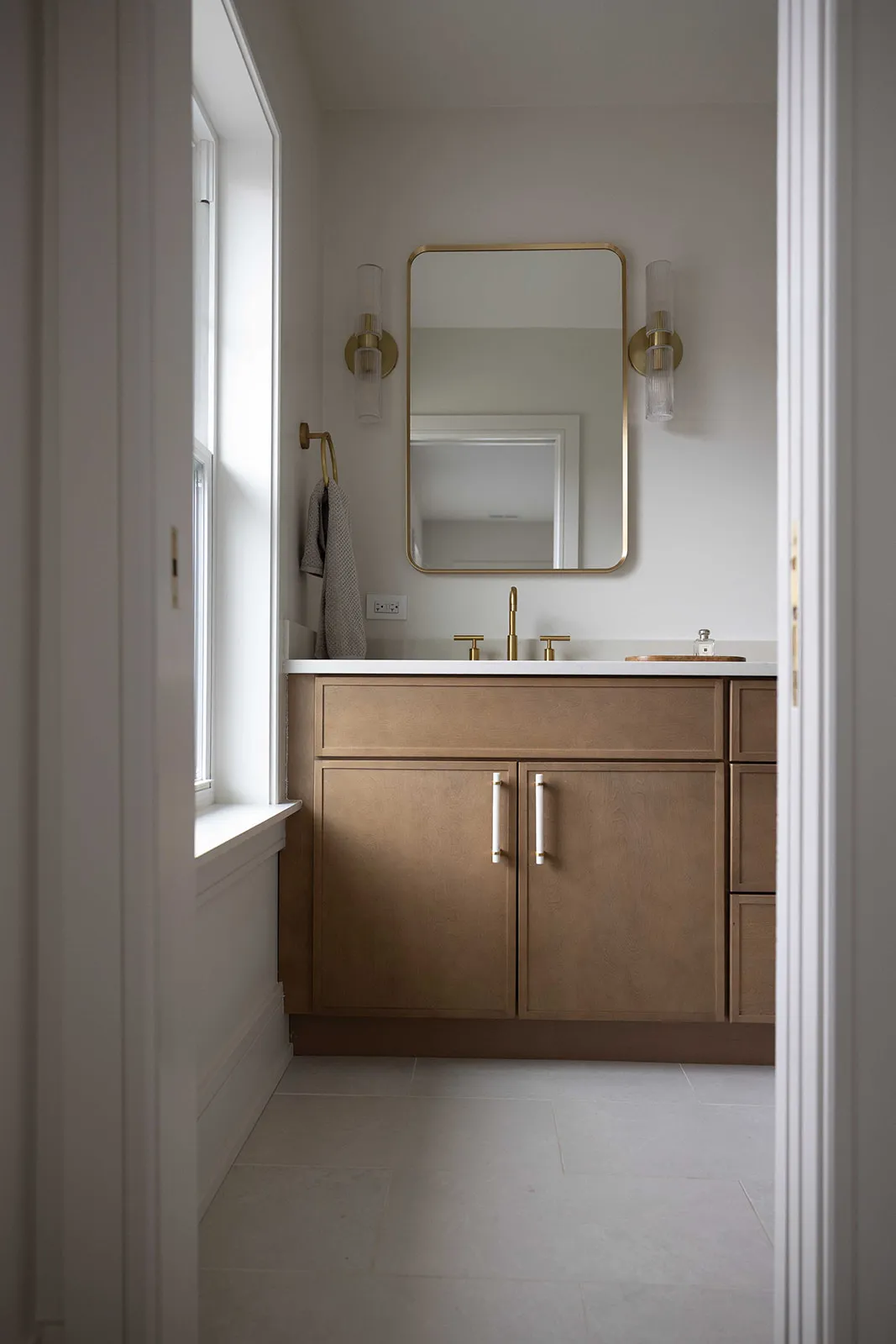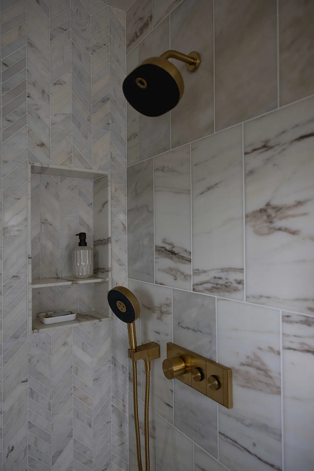 The primary bathroom shifts in tone — organic, clean, and modern without feeling fussy. A beautiful marble shower becomes the focal point, surrounded by abundant natural light. The materials speak quietly but confidently, creating a calming, restorative environment for the homeowners.